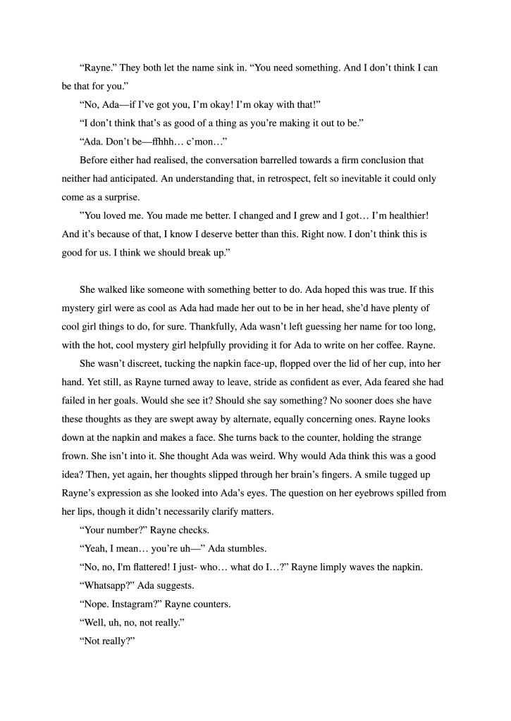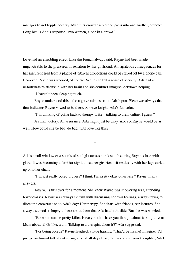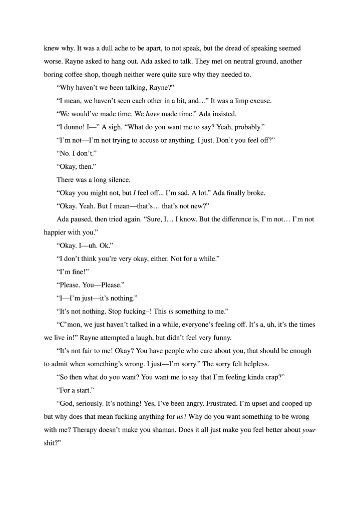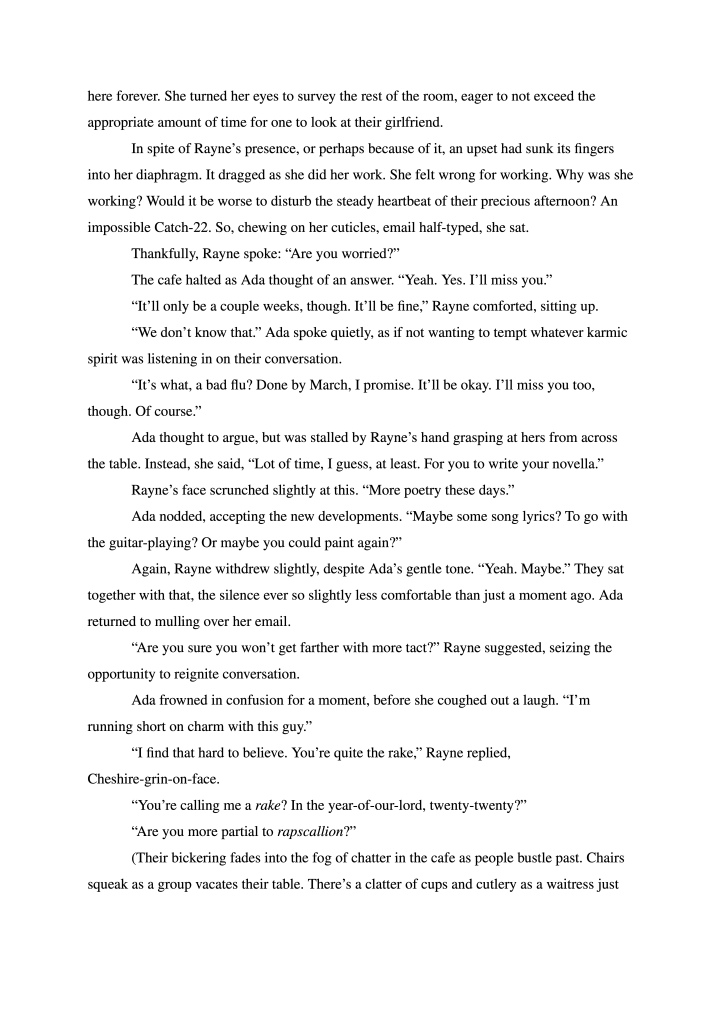 I write for these two a lot in the background. Every once in a while, something happens or a phrase is said which brings them to mind. The original conceit was to intersperse the story with minor alterations to the world–Neologisms or simple, unobtrusive practices which would then have citations explaining them. I finished up a short story version without any citations for a class. But now, if I’m ever getting around to finishing their story, it’s going to happen a long time in the future. So, I shoving it here to wait.
